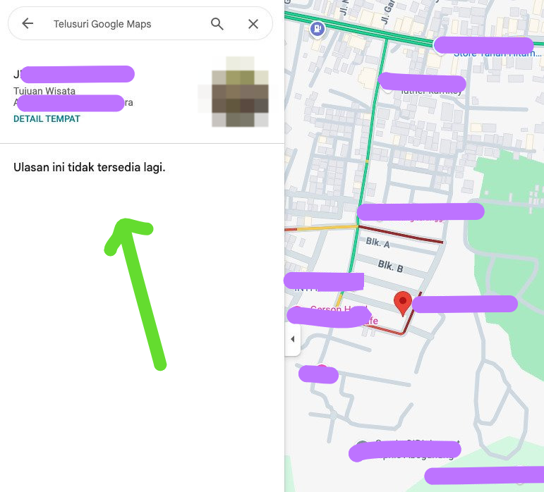 Setelah proses pelaporan kami jalankan dan dimonitor, berselang 1×24 jam, ulasannya hilang dari Google Maps.