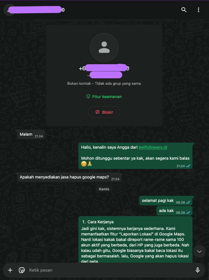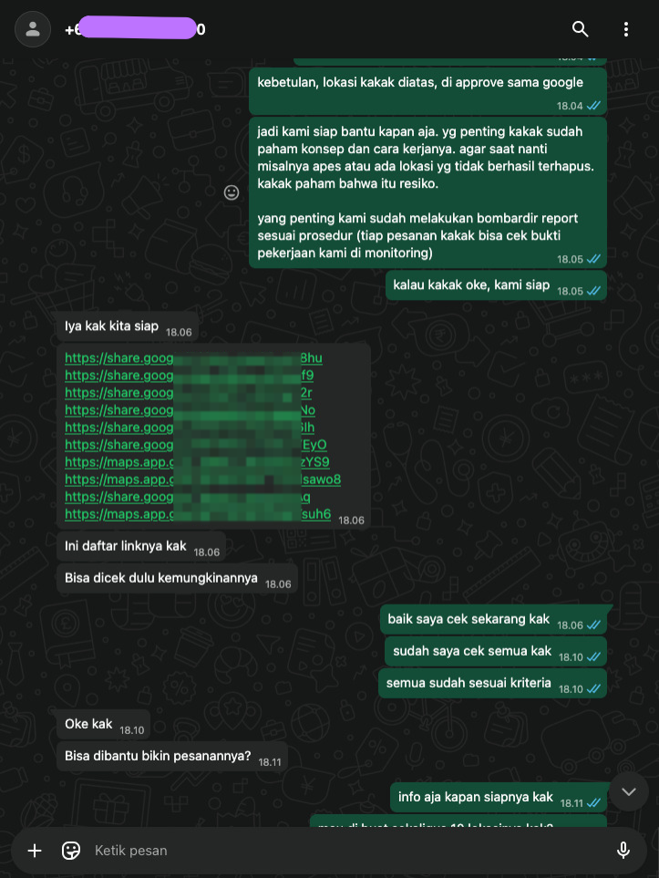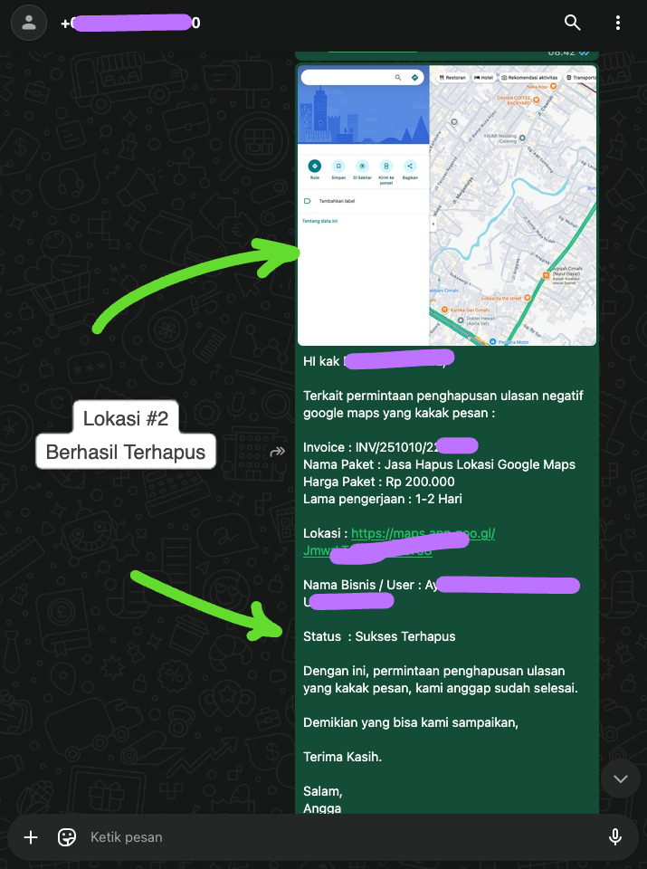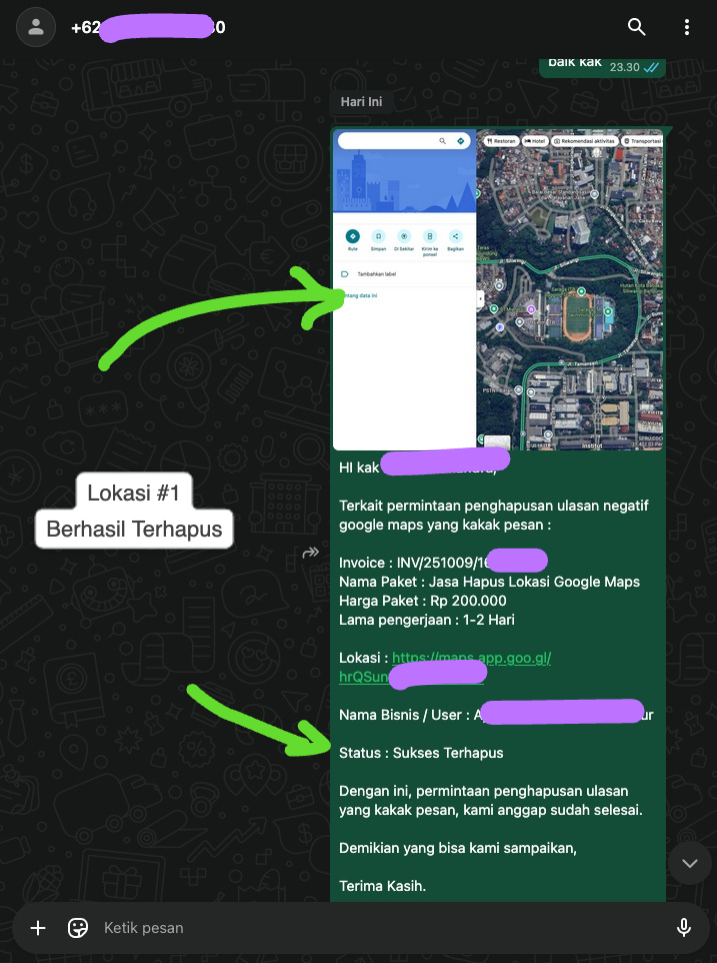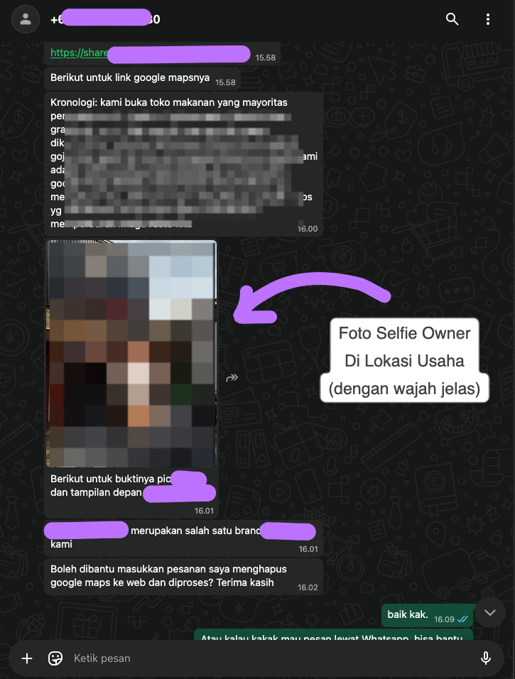 Owner menghubungi kami lewat WhatsApp untuk menanyakan cara kerja layanan hapus lokasi Google Maps. Kami menjelaskan prosesnya secara detail, termasuk syarat, durasi, dan sistem kerja tim kami.