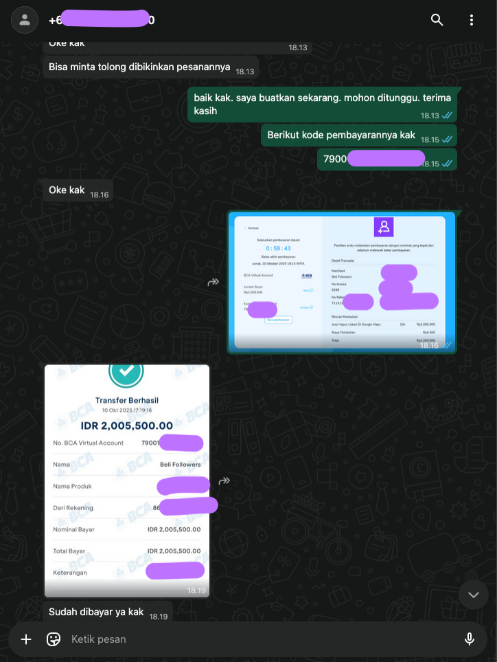Owner kemudian memesan layanan hapus lokasi Google Maps untuk 10 cabang sekaligus, dan mengirimkan bukti transfer sesuai biaya yang disepakati.