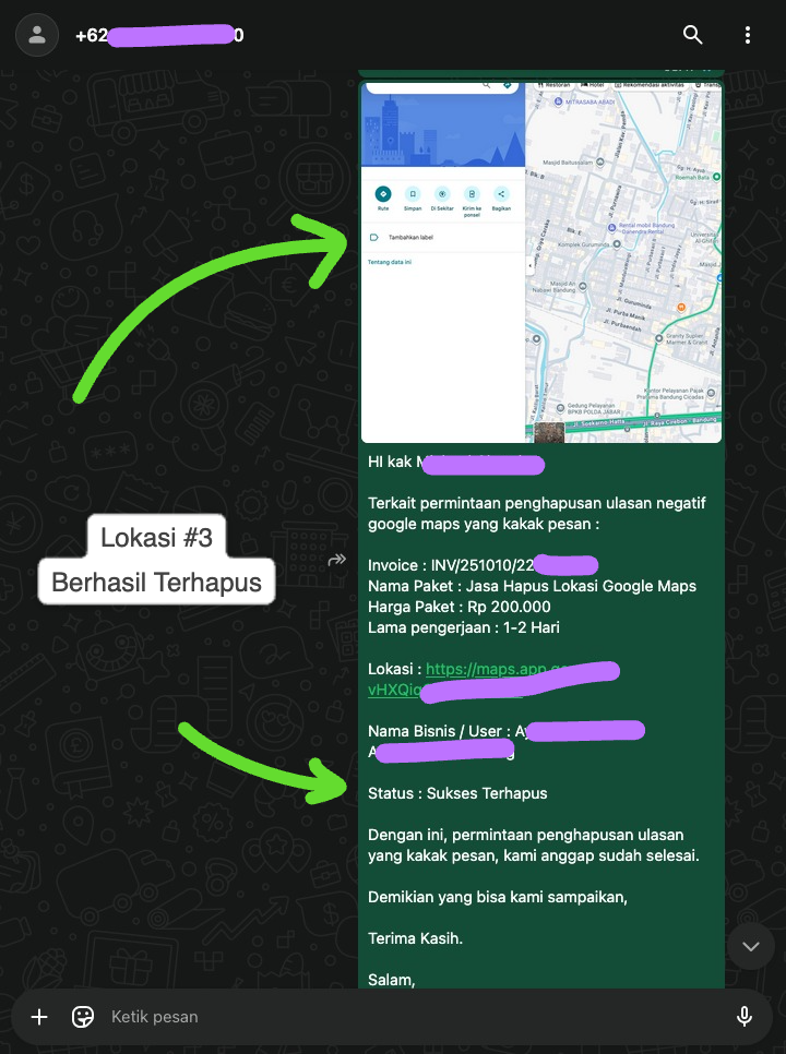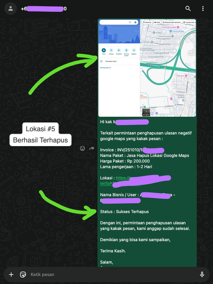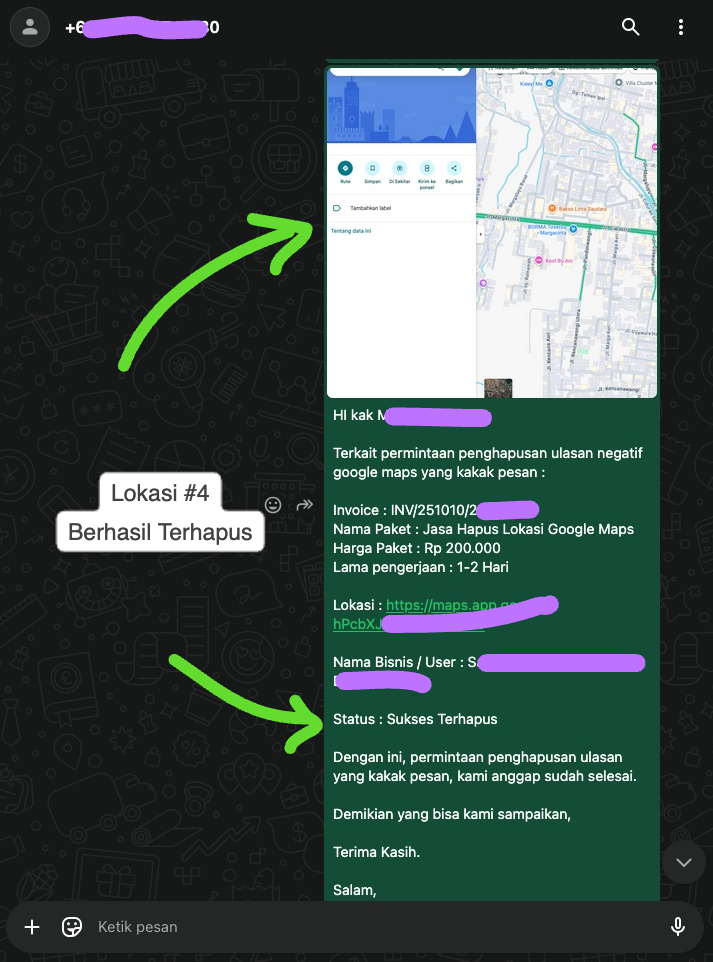 Kalau kamu ingin hasil yang lebih maksimal (misalnya banyak cabang atau sudah lama tidak aktif), tim kami bisa bantu prosesnya langsung hingga lokasi benar-benar hilang dari peta. Silahkan hubungi kami via Whatsapp (tombol WA kanan bawah).